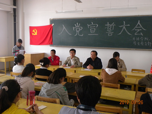 9月26日中午,best365网页学生党支部在3号楼604教室举行了庄严而隆重的学生党员宣誓活动。出席此次活动的有best365网页版登录副书记刘锐同志,第一学生党支部书记魏衍学同志,第二学生党支部书记裴晓黎同志及八十多名学生党员和入党积极分子。21名新发展的预备党员进行了入党宣誓,预备党员代表发言并承诺入党誓言。之后,刘锐副书记为此次活动作了总结并对新党员提出了希望,希望各学生党员能严格要求自己,提高个人素质,学好专业知识,转变就业观念,开拓思路。最后,刘书记又具体的部署了学生党支部今后的工作,同时还着重强调了十一期间的安全问题,要求学生党员一定要起好模范带头作用。